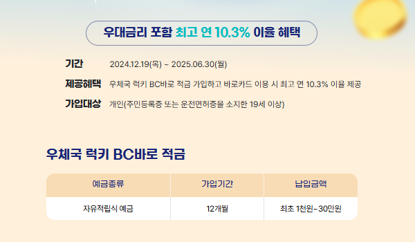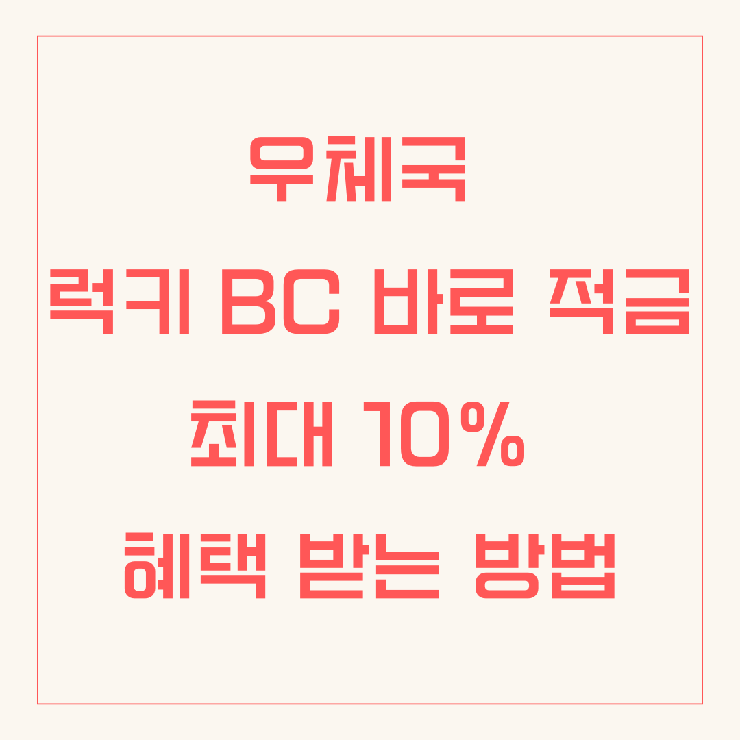 우체국 럭키 BC 바로 적금은 우체국과 BC카드가 제휴하여 출시한 1년 만기 자유적립식 적금 상품입니다. 기본금리에 우대금리와 BC카드 특별 리워드를 더해 최대 10.3%의 혜택을 받을 수 있다는 것이 가장 큰 장점이죠.