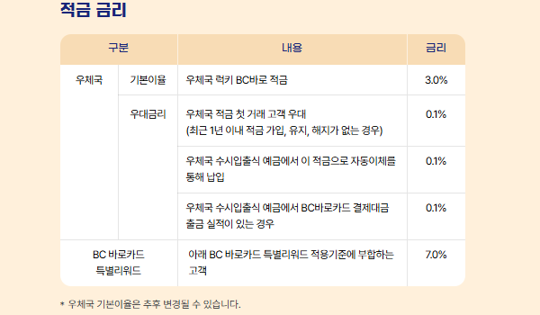 - BC바로카드 결제계좌: BC바로카드 결제대금 출금 계좌를 이 적금 계좌로 지정하면 0.1%p 우대금리를 제공합니다.