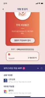 - 스마트폰에 설치된 앱을 검사하여 보이스피싱 관련 악성 앱이 감지되면 경고합니다.
