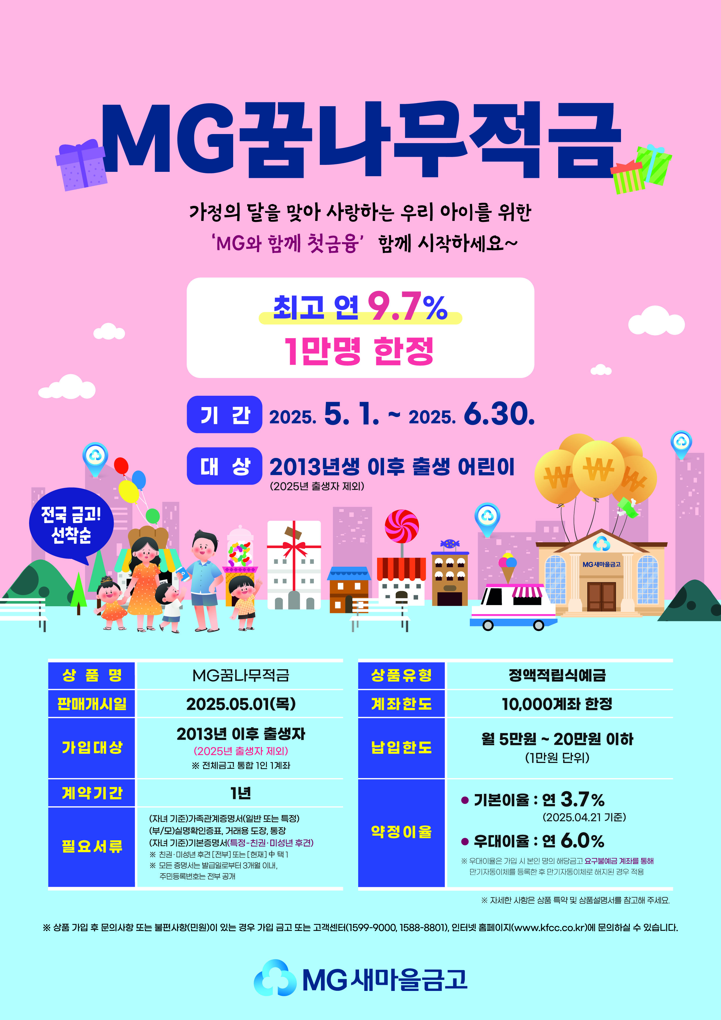 2025년 5월, 전국 ‘맘카페’를 들썩이게 만든 초고금리 적금 상품이 등장했습니다. 바로 새마을금고에서 출시한 MG꿈나무적금입니다. 자녀 명의로만 가입 가능한 1년 만기 연 9% 금리 상품으로, 한정 판매에도 불구하고 전국 수만 가구가 몰리며 '오픈런' 현상까지 벌어졌죠.