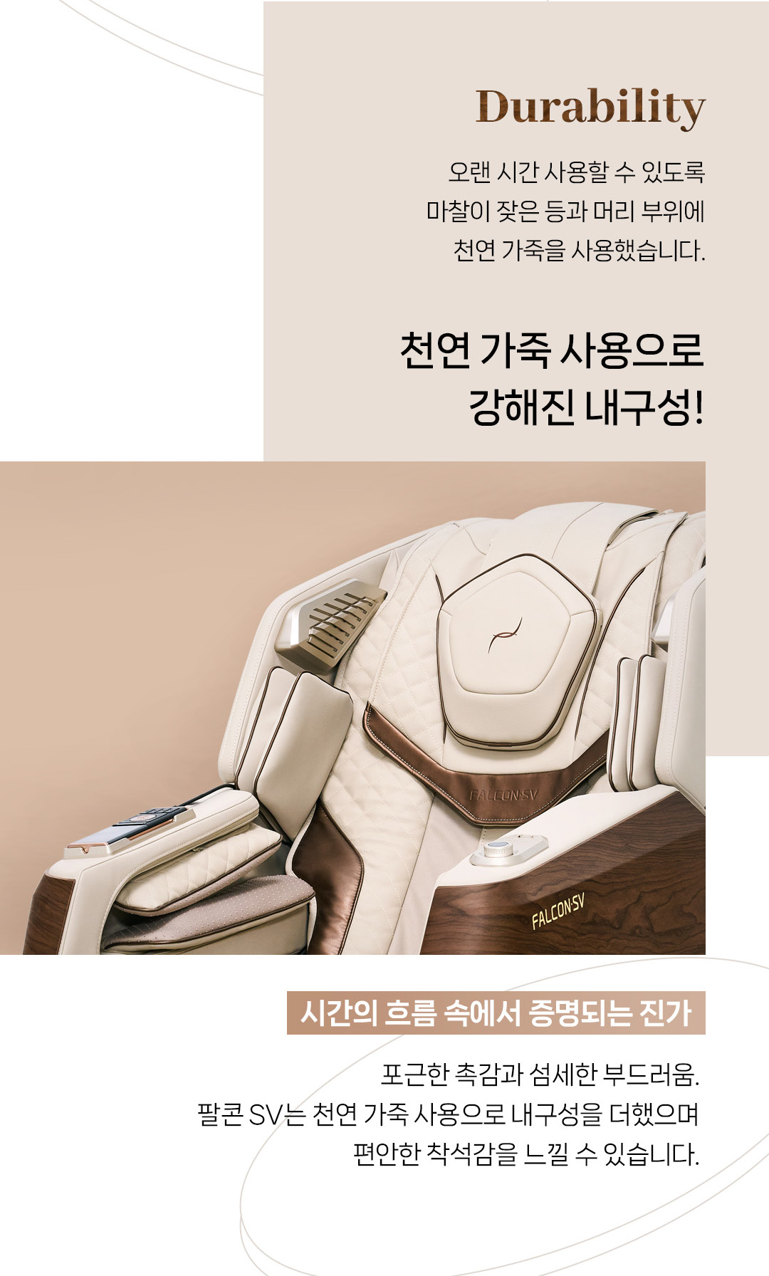 팔콘SV는 마찰이 잦은 등과 머리 부위에 천연 가죽을 사용하여 내구성을 강화했습니다. 부드러운 촉감과 뛰어난 내구성을 갖춘 천연 가죽은 오랜 시간 사용에도 변함없는 편안함을 제공합니다.