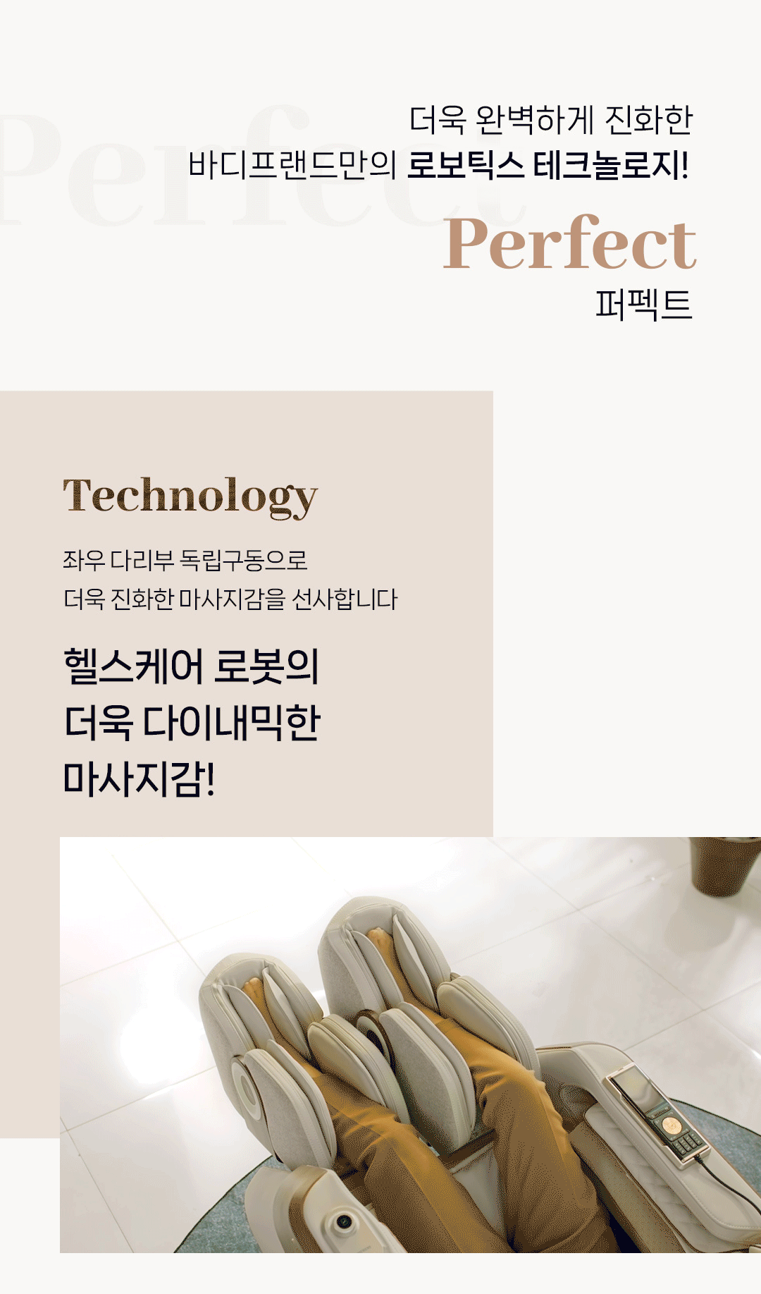 - 로보틱스 테크놀로지: 좌우 다리부가 독립적으로 구동되어 더욱 섬세하고 역동적인 마사지를 제공합니다.