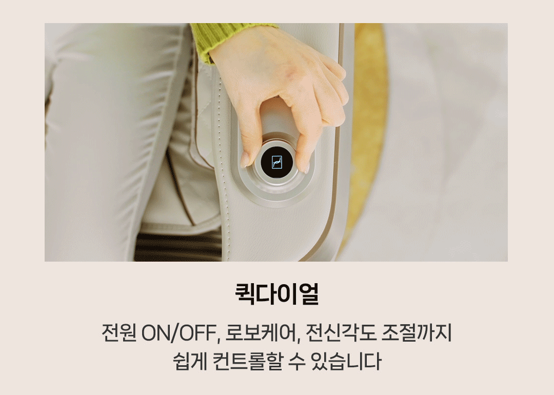 전원 On/Off, 로보케어, 전신 각도 조절 등을 간편하게 제어할 수 있는 퀵 다이얼, 등과 종아리 부분에 온열감을 더해 마사지 효과를 높이는 온열 기능, 36개의 에어백으로 전신을 빈틈없이 마사지하는 에어백 기능 등 사용자 편의를 위한 다양한 기능이 탑재되어 있습니다.