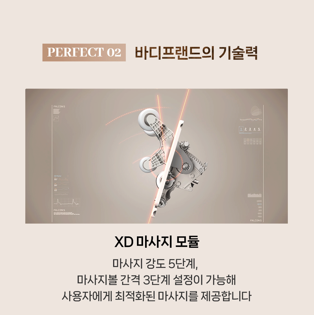 팔콘SV는 XD 마사지 모듈을 통해 마사지 강도와 마사지볼 간격을 조절하여 사용자 맞춤형 마사지를 제공합니다. 또한, 좌우 팔 마사지부에 탑재된 손지압 패드는 손의 피로를 효과적으로 풀어줍니다.