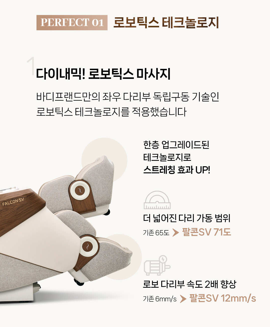 팔콘SV에는 바디프랜드만의 독자적인 로보틱스 테크놀로지가 적용되어 더욱 섬세하고 역동적인 마사지를 제공합니다. 좌우 다리부가 독립적으로 구동되어 마치 사람 손과 같은 섬세한 마사지를 구현하며, 다리 가동 범위가 기존 65도에서 71도로 넓어져 더욱 시원한 스트레칭 효과를 선사합니다. 또한, 로보 다리부의 속도가 2배 향상되어 더욱 강력하고 효과적인 마사지를 경험할 수 있습니다.