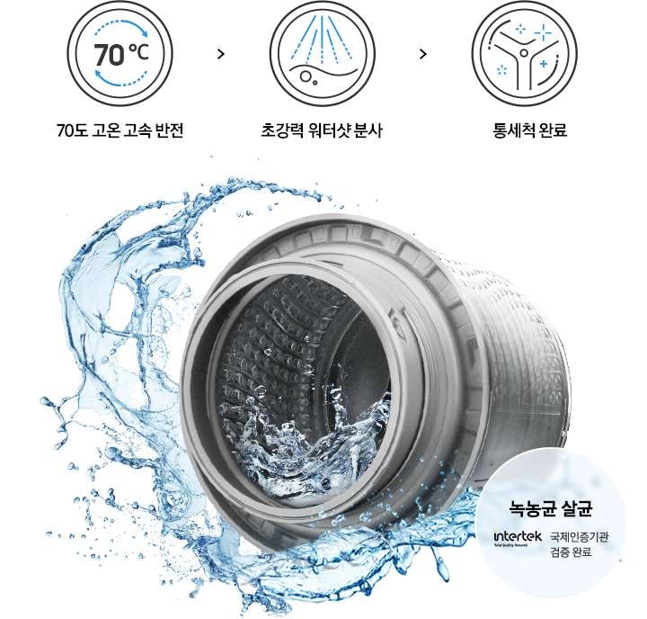 무세제통세척+ 기능은 세제 없이도 70도 고온수와 초강력 워터샷으로 세탁조를 청소하여 세균 번식을 억제합니다.