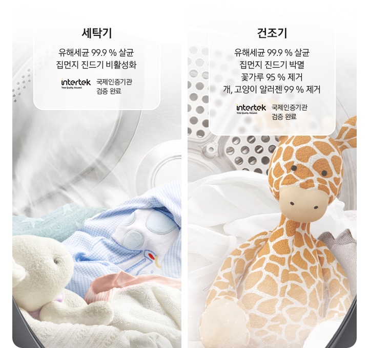 세탁기 살균세탁 코스는 유해 세균 99.9% 살균하고 집먼지 진드기를 비활성화합니다. 건조기 살균건조 코스는 유해 세균, 집먼지 진드기, 꽃가루는 물론 반려동물 알러젠까지 99% 제거합니다.